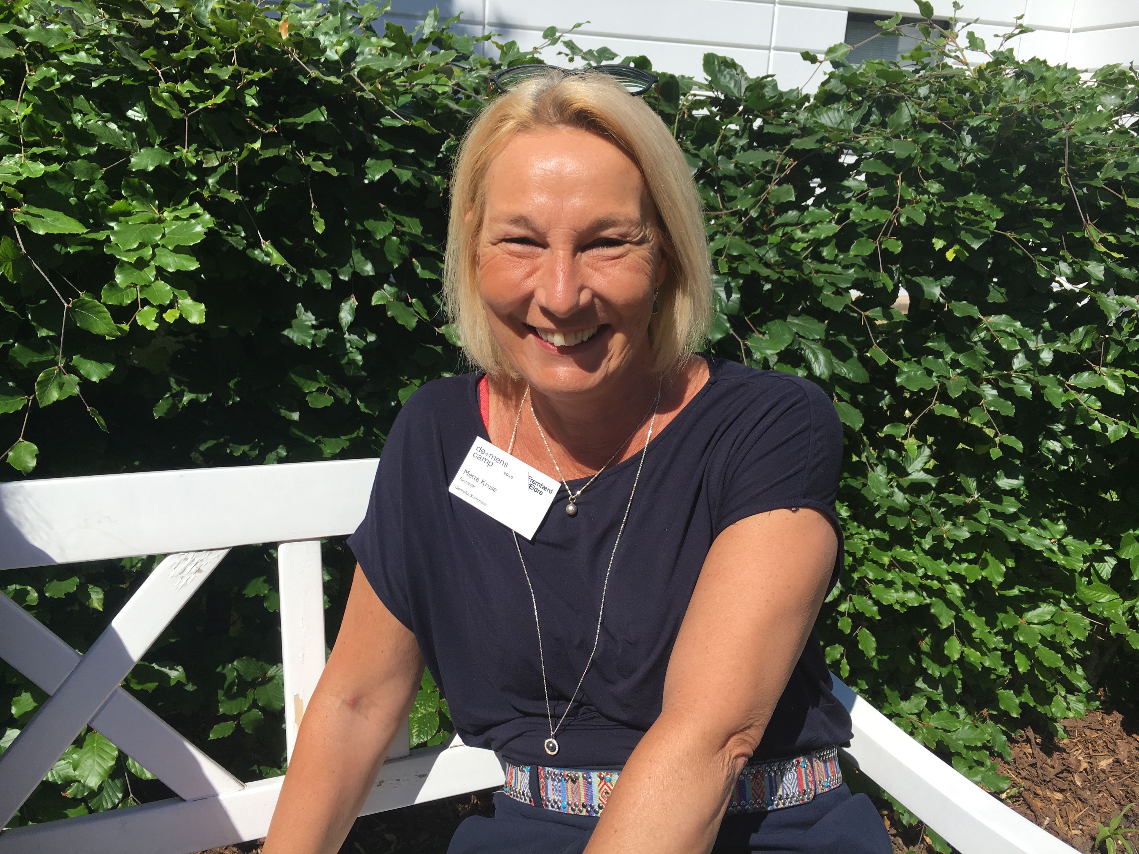 - Jeg er forholdsvis ny i jobbet, og campen giver mulighed for, at det nye demenshold, jeg er en del af, får et fælles sprog og et fælles udgangspunkt. Vi er syv afsted fra kommunen, og vi har tidligere overvejet at leje et sommerhus og lave vores egen camp. Men jeg er bange for, at vi vil gå døde i det. Her er pauser, hvor man får inspiration udefra, og vi er trods alt ikke så mange timer sammen, at vi begynder at vrisse af hinanden og tabe koncentrationen. Vi håber, at campen kan være med til, at vi får justeret vores demenshandleplan, så den bliver politisk godkendt. Vi skal have ændret ordlyden, så alle kan forstå, hvad der står i den og vendt perspektivet, så den er mere rettet mod borgeren og ikke så meget mod, hvad vi som medarbejdere skal gøre. Det er utrolig inspirerende at være her, og jeg har allerede sendt en invitation ud til en anden kommune, hvor jeg gerne vil ud og se deres dagcenter.