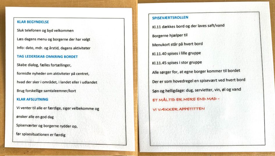 Hun understreger, at alle, også elever, skal kunne agere spisevært. Plejecentret har derfor fået udarbejdet nogle små lommekort til medarbejderne, der fortæller, hvad rollen indebærer.