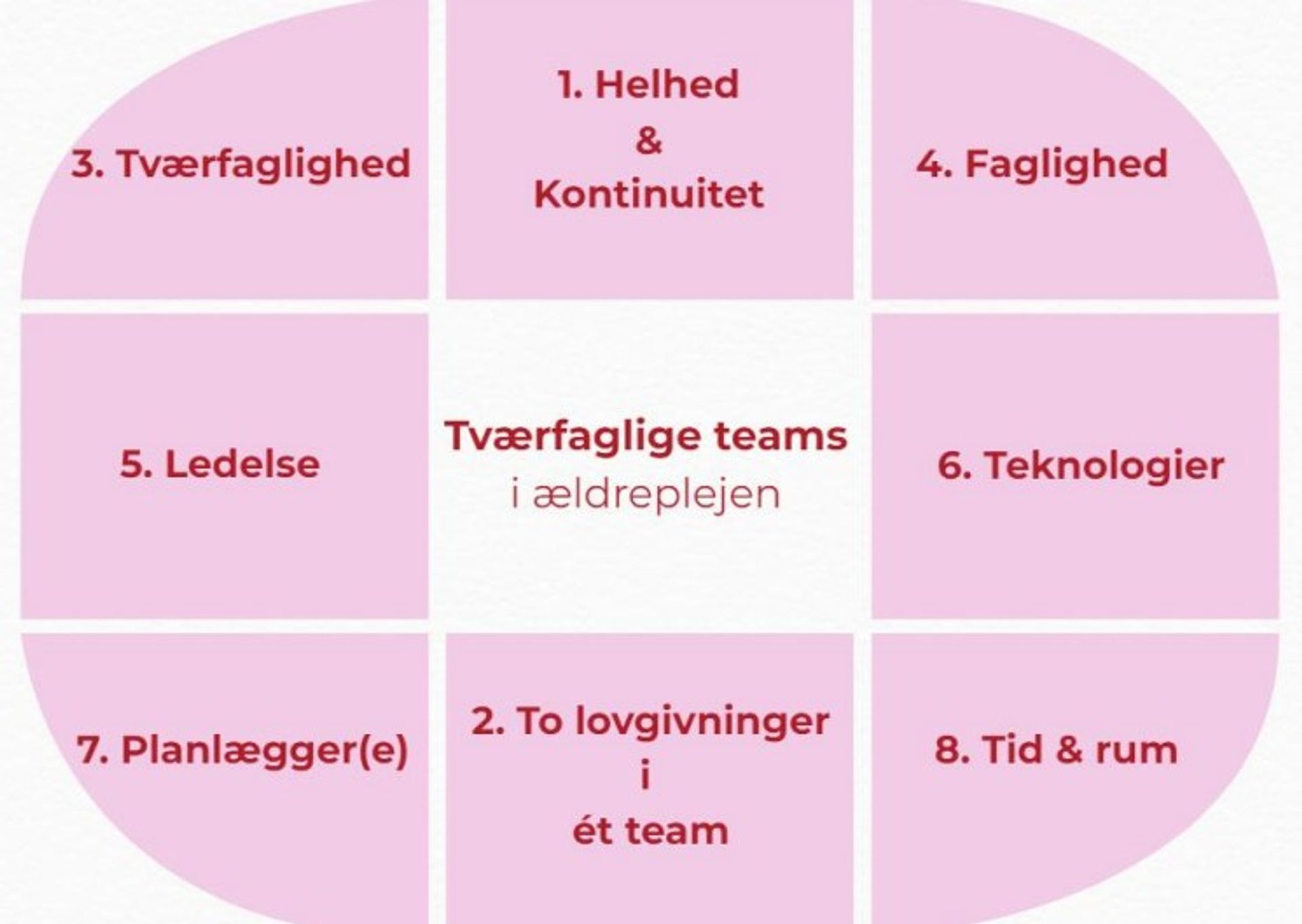 Derfor peger rapporten på otte opmærksomhedspunkter, man bliver nødt til at have fokus på for at lykkes. Det er punkter og temaer, som ledere og medarbejdere kan diskutere og forholde sig til i arbejdet med organisering af tværfaglige faste teams.