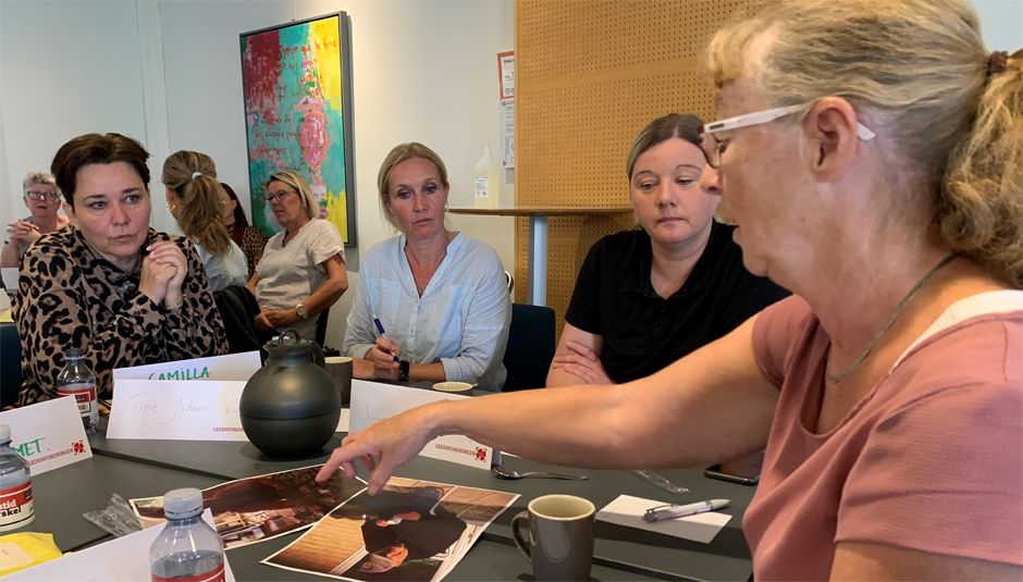 De har fået som hjemmeopgave at tage et billede med, der fortæller om, hvordan man skaber kvalitet i kerneopgaven. To og to skal deltagerne snakke om billederne og fortælle hinanden, hvad der rører dem ved den andens historie, og hvor de bliver inspireret.