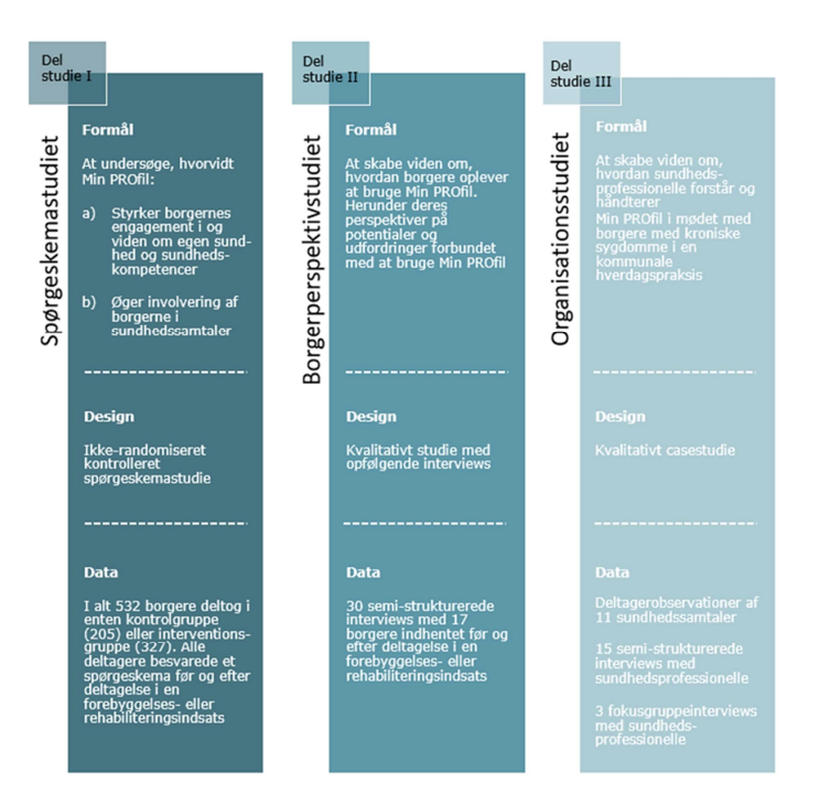 Forskningsprojektet bestod af tre delstudier: et spørgeskemastudie, et kvalitativt studie og et organisatorisk studie, der tilsammen undersøger borgerrelaterede effekter og oplevelser samt organisatoriske potentialer og udfordringer ved at implementere PRO i sundhedssamtaler.