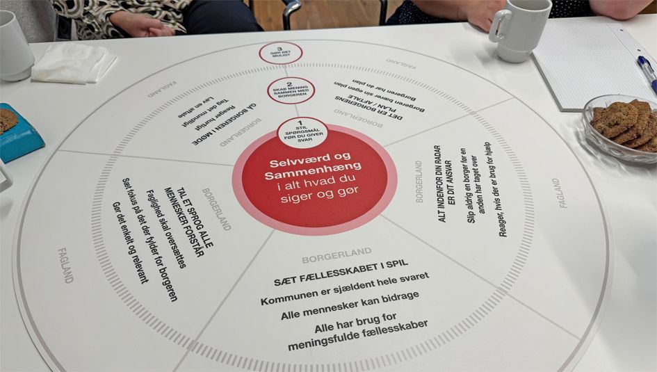 Længere ude i cirklen er bærende værdier som "Gå borgeren i møde" og "Alt indenfor din radar er dit ansvar" inspireret af Tivolis 3-meter-regel.