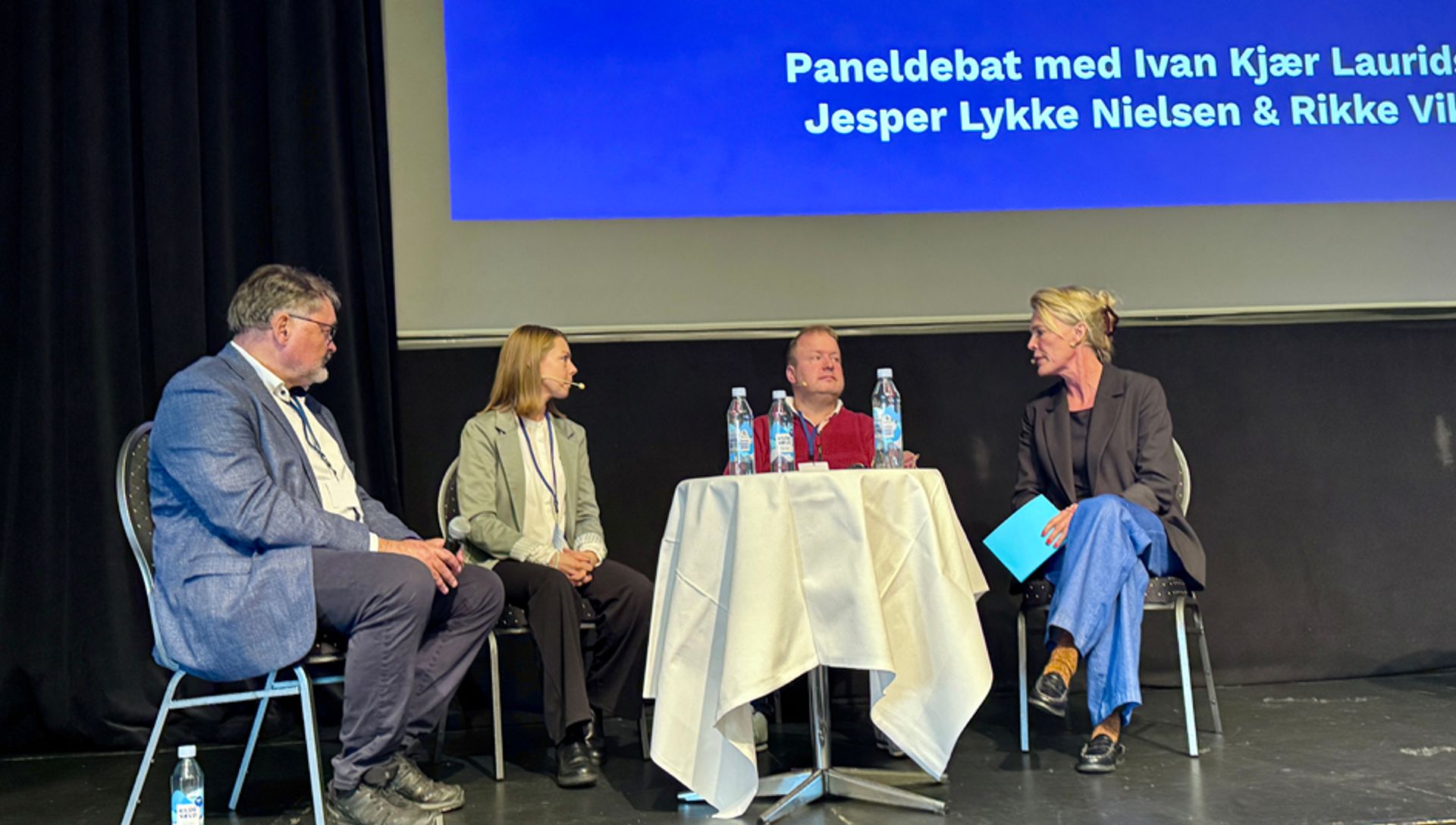 Paneldebat med (fra venstre): Ivan Kjær Lauridsen, velfærdsteknologichef i Aarhus kommune, Rikke Vikær, fysioterapeut og teamkoordinator i DigiRehab i Vejle kommune, Jesper Lykke Nielsen, SOSU-hjælper og velfærdsteknologikoordinator i København Kommunes hjemmepleje og Karen Lorentzen, facilitator fra Operate.
