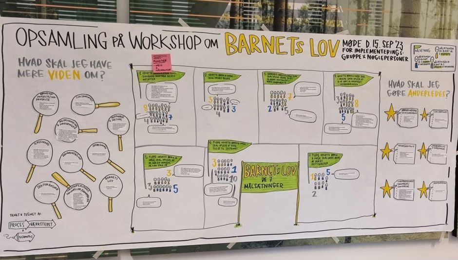 Efter workshoppen blev det besluttet at koble en grafisk facilitator på, der skal visualisere forløbet i en række tegninger, som hænger på gangene i den bygning, hvor medarbejdere fra både PPR, dagtilbuds- og skolekonsulenter, dagpleje og sundhedstjeneste har sin gang.