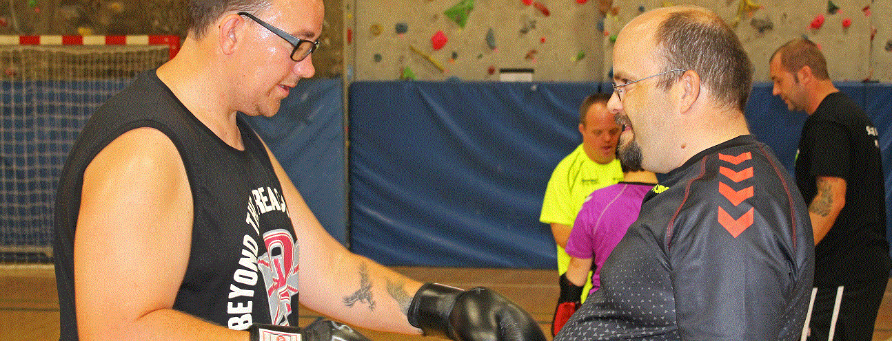 Efter frokost er det blevet tid til boksetræning med både hård fysisk opvarmning og en masse øvelser med handskerne på. Selvom deltagerne får sved på panden, bliver træningen holdt på et niveau, hvor alle kan være med.