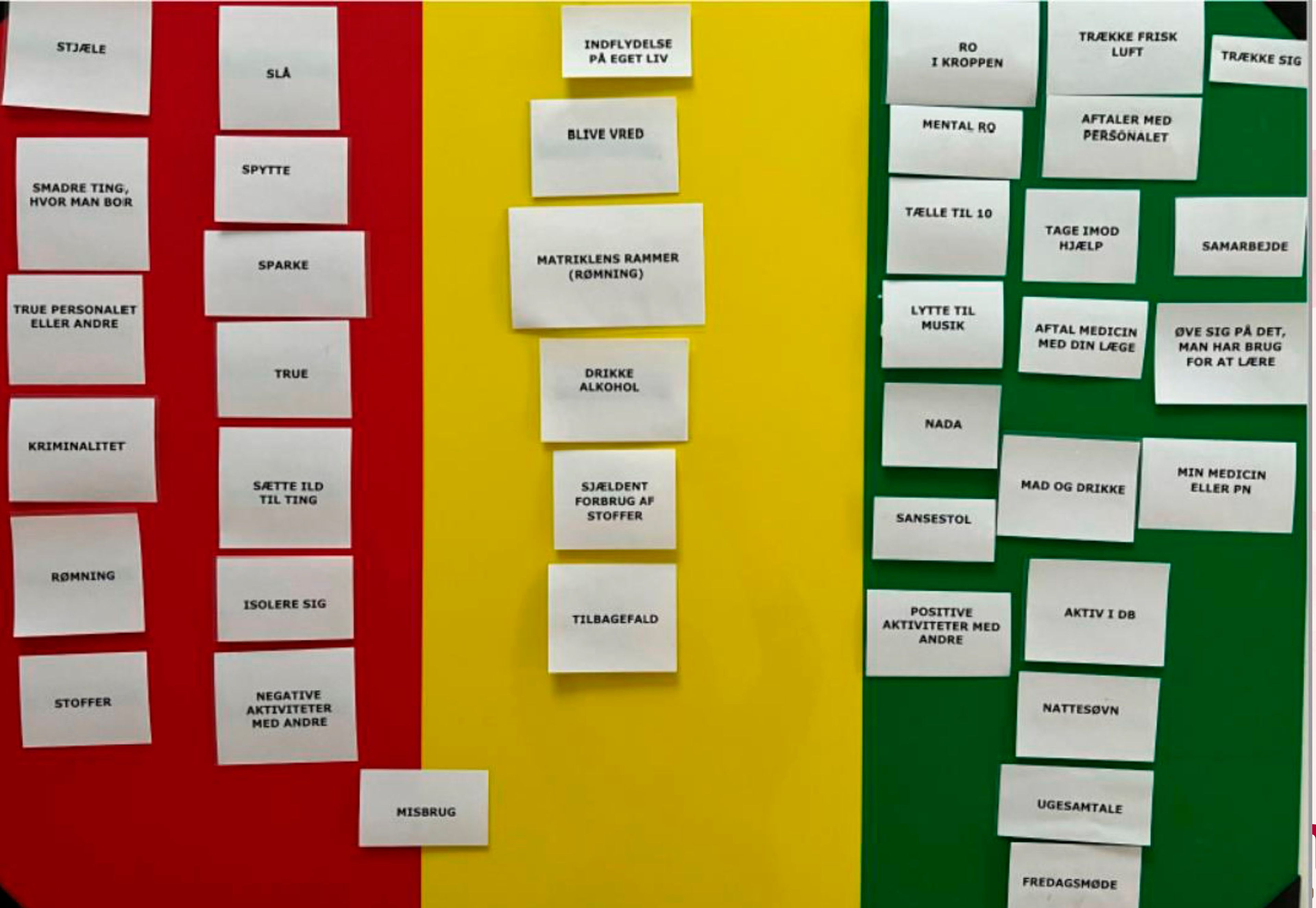 Billedet er et eksempel fra et kursusforløb. Der er fokus på de temaer, som borgerne er optaget af, og de er derfor selv med til at skabe indholdet på trafiklystavlen. Redskabet er så simpelt og letforståeligt, at borgerne har let ved at koble sig på det - og efterfølgende bruger det i deres hverdag.
