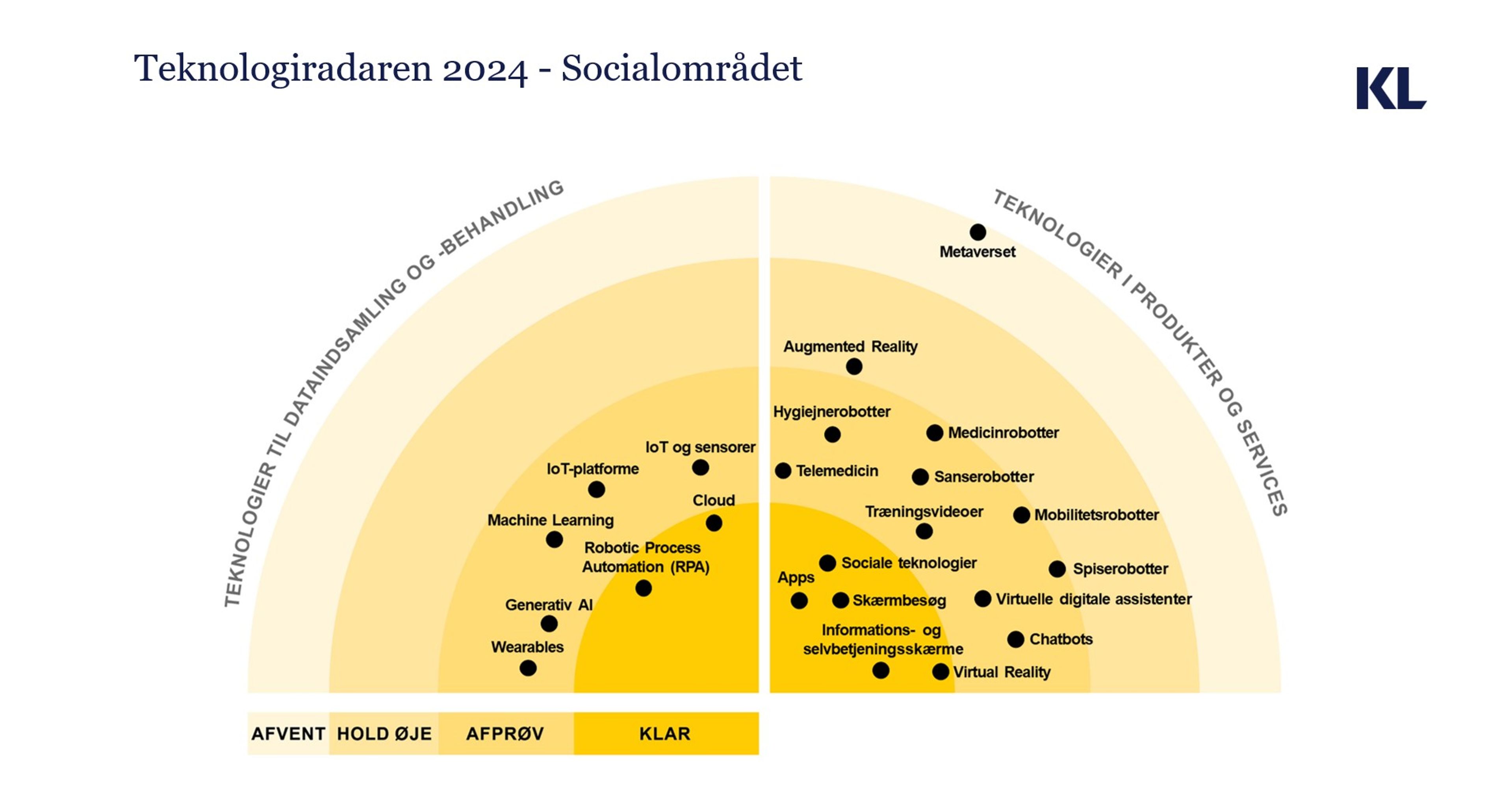 Radaren ser på teknologier, alt efter hvilket modenhedsstadie de er på: KLAR, AFPRØV, HOLD ØJE og AFVENT. En kommune kan fx tage udgangspunkt i teknologiradaren, når man vil satse på nye teknologier. På radaren kan man se, hvilke teknologier andre kommuner har gjort sig gode erfaringer med i driften, og hvilker der stadig er mindre teknisk modne.