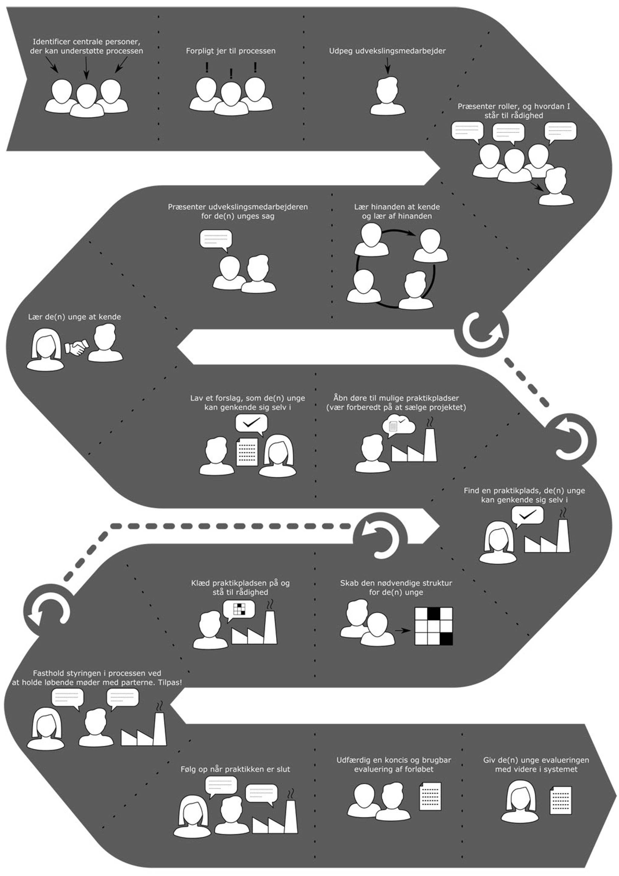 4) Afdæk ønsker og muligheder - udform en plan. Fremgangsmåden har været, at udvekslingsmedarbejderen har holdt et uformelt møde med den unge, hvor de har kunnet tale helt frit om interesser og gradvist har bevæget sig ind på, hvad der beskæftigelsesmæssigt kunne give mening. Derefter har udvekslingsmedarbejderen undersøgt muligheder for at finde praktikker, der kunne matche det ønskede. Mulighederne er dernæst blevet præsenteret for den unge. I en sådan proces får de unge i højere grad en følelse af, at de faktisk selv er med til at definere, hvilken retning de gerne vil følge.