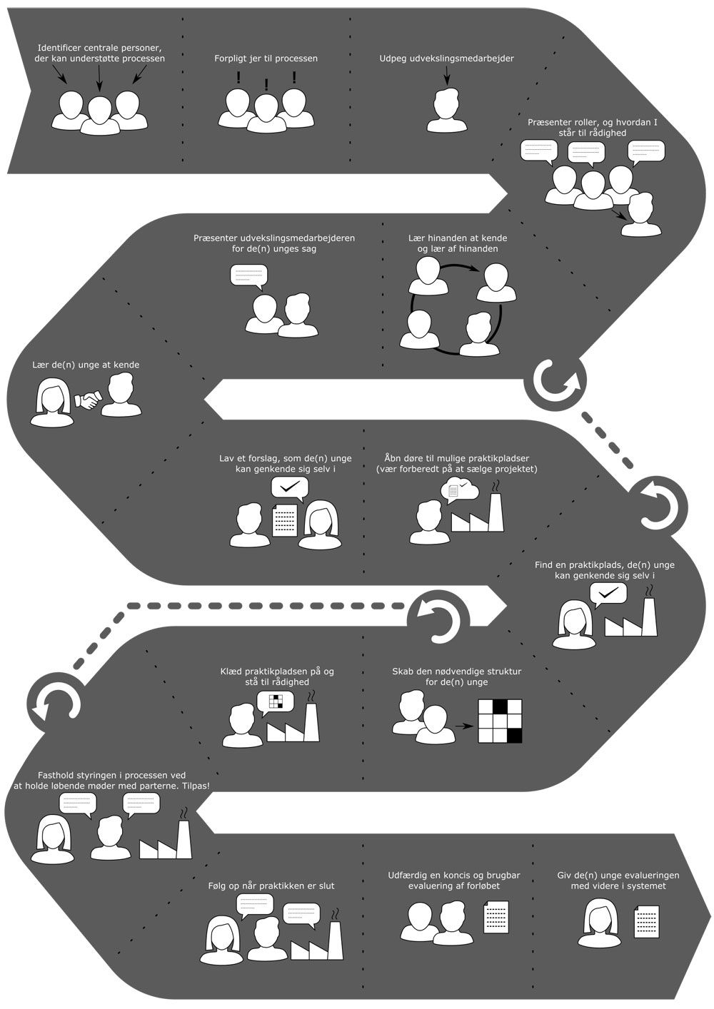6) Fokus på afkast. Lav en proces for opfølgning, så de unge får noget med fra processen. Tænk på det som materiale til den unges CV. Helt konkret har projektet tænkt i at udforme en model for, hvordan vi kan følge op på praktikkerne på en struktureret måde, så personer den unge fremadrettet vil møde hurtigt vil kunne afkode den unges sag og servicere denne så godt som muligt.