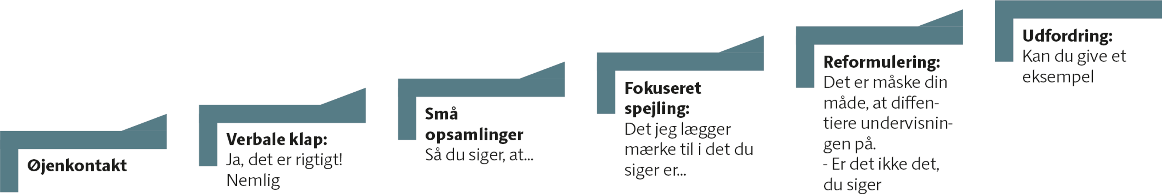 Lederen skal lytte aktivt som i en superviserende samtale og gerne samle op, spejle og tilbyde positive reformuleringer undervejs, som er afstemt med relationen og situationen.