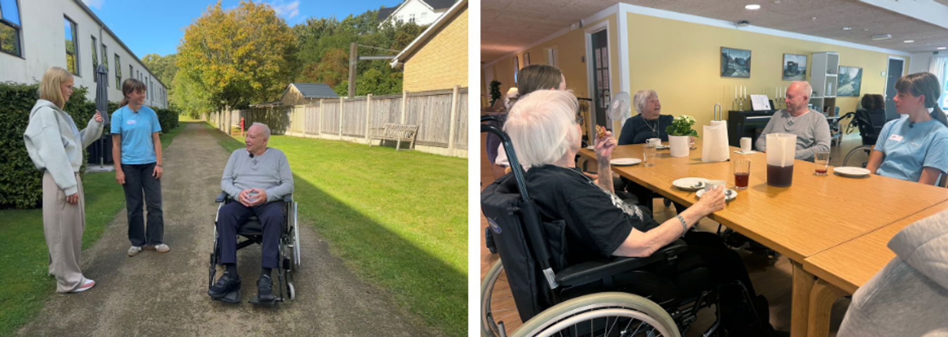 I to timer hygger de sig med plejehjemsbeboerne; spiller ludo og klodsmajor, går ture, ordner negle på damerne og laver æblecrumble for bare at nævne nogle af de initiativer, som eleverne sætter i gang.