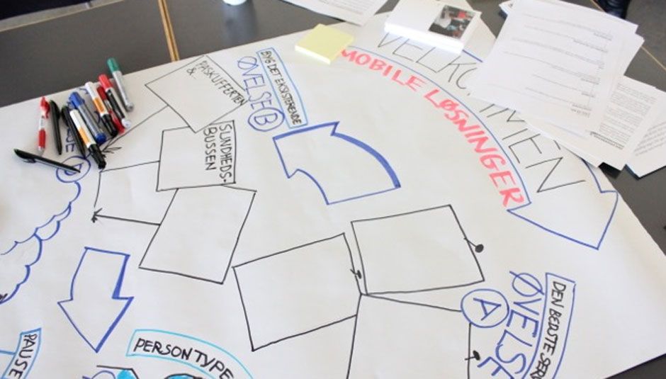 Der blev holdt en workshop, hvor både medarbejdere og borgere deltog, og hvor hele processen var skitseret på en papirdug, lagt ud på et langbord.