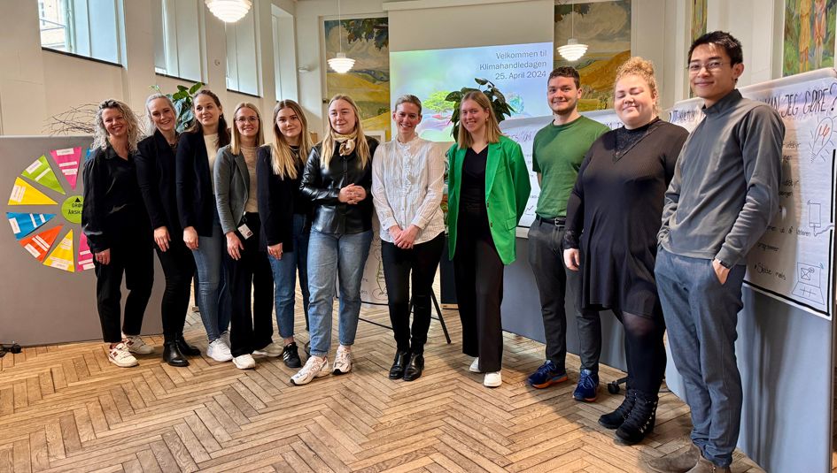 - Velkommen til klimahandledagen. Vi er 13 megafriske kontorelever, der har fået en god idé om at udbrede de grønne ideer her i Kolding Kommune. Vi har været rundt i vores fire forvaltninger og finde gode bæredygtige tiltag, der kan spredes til andre dele af kommunen.