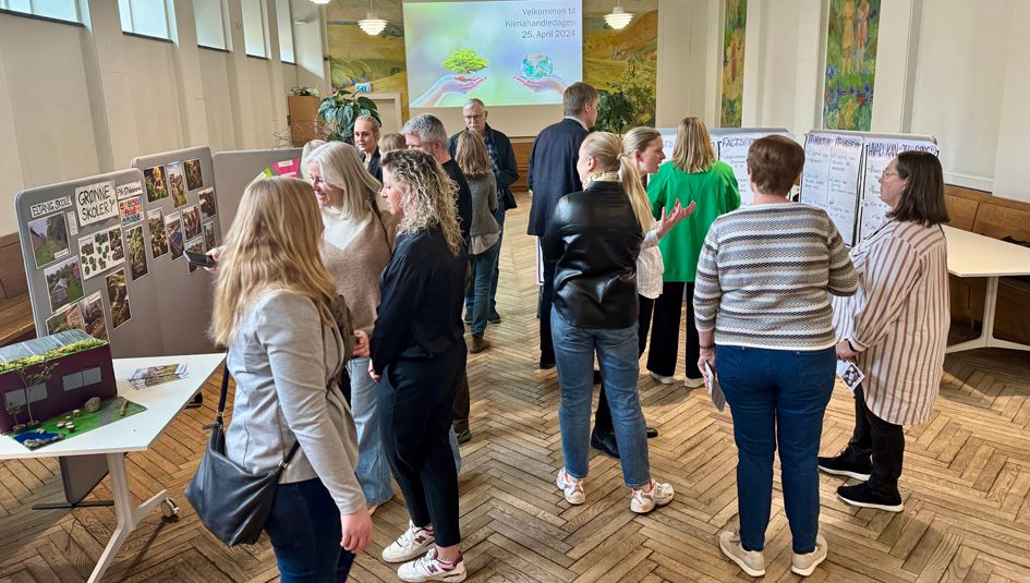 I små grupper står kontoreleverne med flyers i hænderne, plancher på væggene og fysiske modeller bl.a. af en skole med solfangere og græs på taget. Ideen er at vise mangfoldigheden i de bæredygtige tiltag, der allerede tages i Kolding Kommune.