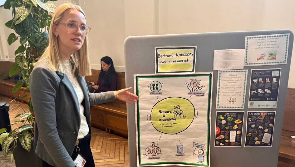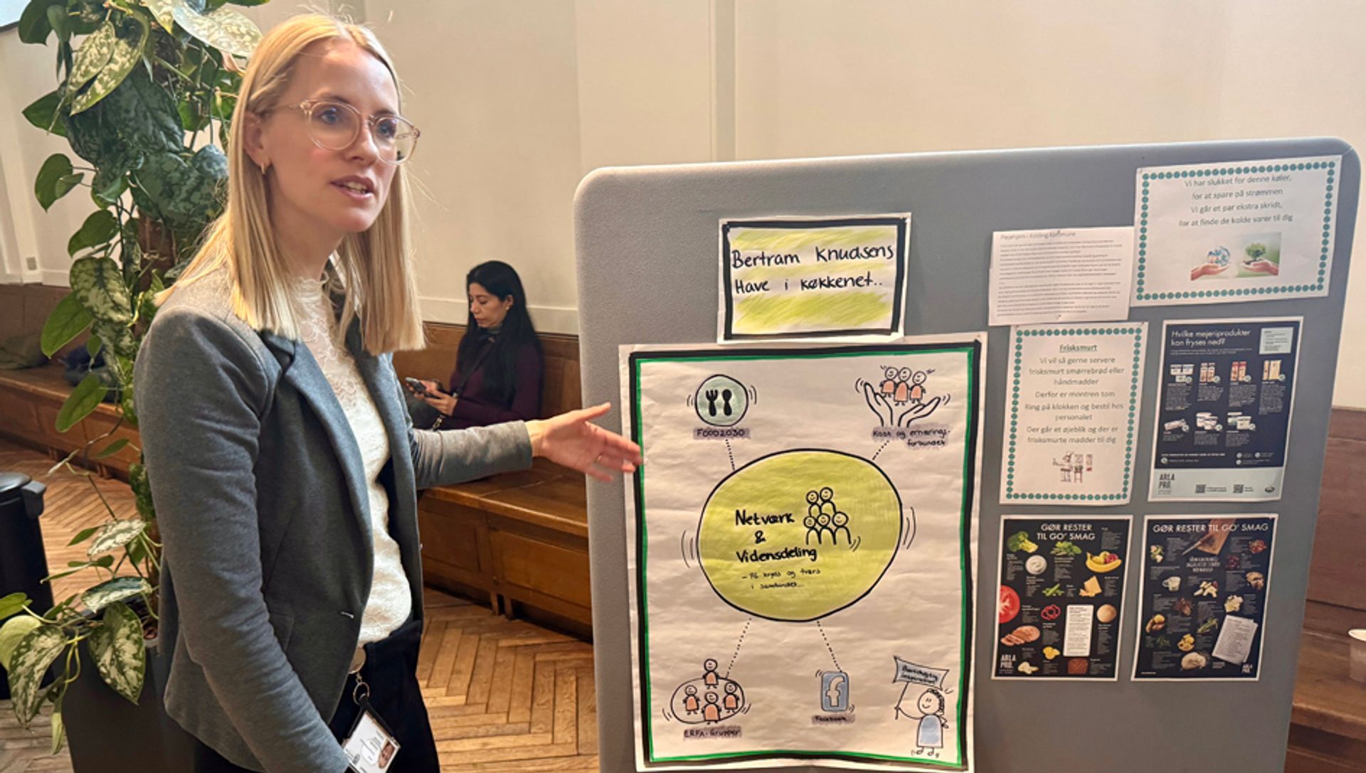 Caroline Steiner Jørgensen er kontorelev i Kolding Kommune og viser rundt i festsalen under Social og Arbejdsmarkedsforvaltningen, der denne dag i anledning af den nationale klimahandledag, er omdannet til showroom for grønne ideer.