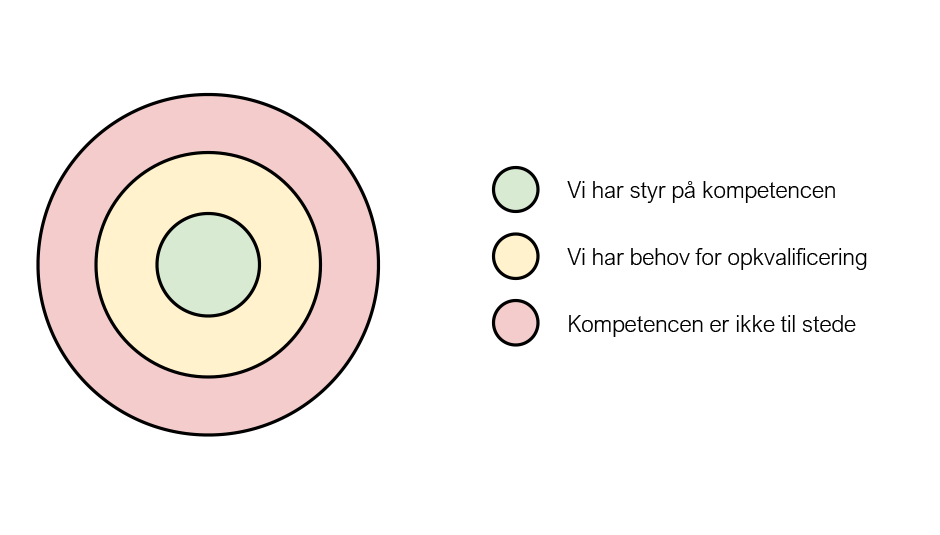 - Tag en snak om niveauet for de enkelte kompetencer og placér dem i Kompetence-skiven alt efter niveau. Vi har styr på kompetencen: Kompetencen er til stede og kan udvikles og/eller udbredes yderligere gennem interne indsatser - f.eks. gennem sidemandsoplæring eller prioriteret brug af målrettede redskaber. Vi har behov for opkvalificering: Kompetencen er delvist til stede, men ikke i tilstrækkelig grad til at den kan udvikles og/eller udbredes yderligere uden opkvalificering eller efteruddannelse. Kompetencen er ikke til stede: Kompetencen er helt fraværende i organisationen. Det kan føre til flere overvejelser Har vi den rigtige strategi? Er der elementer i vores strategi, som vi ikke har forudsætninger for at løse? Er det muligt at opbygge kompetencen på et tilstrækkeligt niveau gennem efter- og videreuddannelse? Kan vi indgå et (eller flere) partnerskab(er) med eksterne samarbejdspartnere, som kan kompensere for de kompetencer, vi ikke selv har?