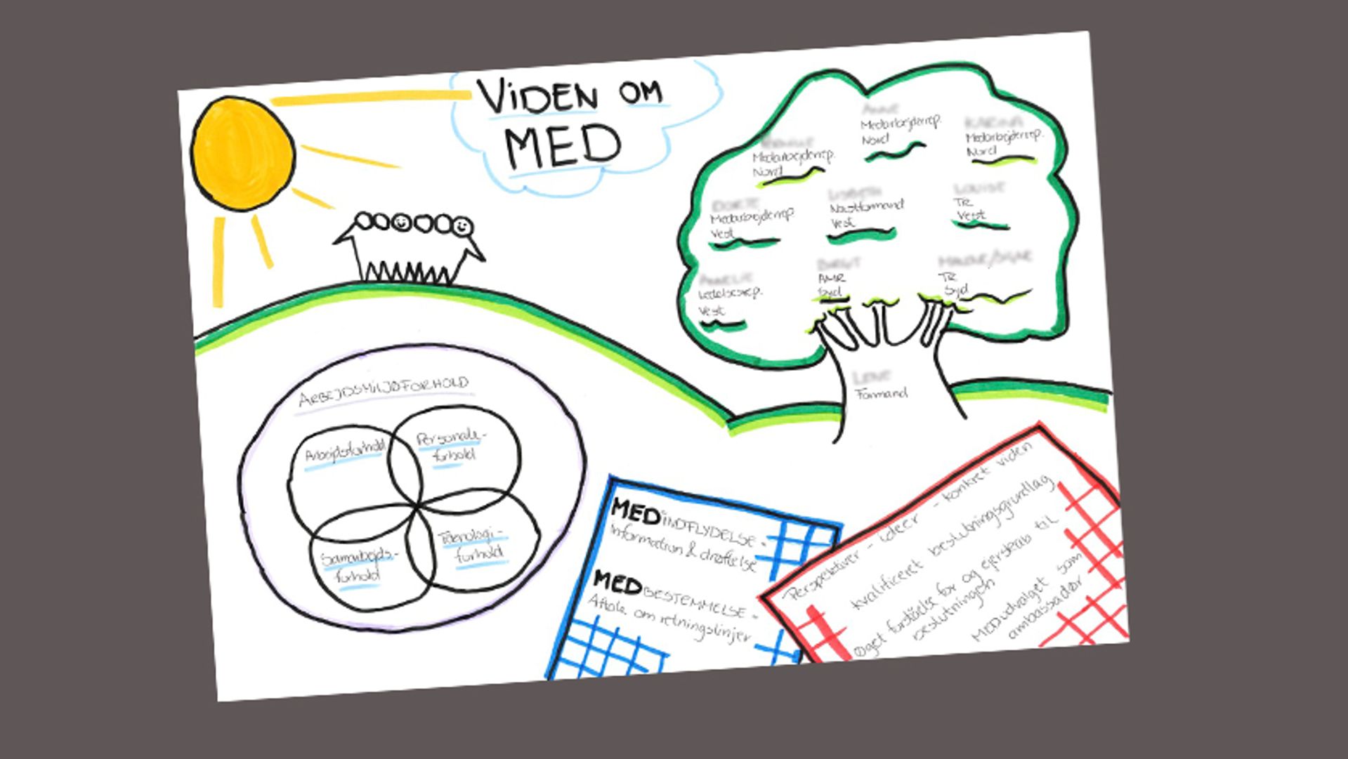 Endelig har MED-udvalget lavet tegninger, der viser, hvad MED-systemet er. Tegninger, som de har hængt steder, hvor medarbejderne ikke kunne undgå at se dem.