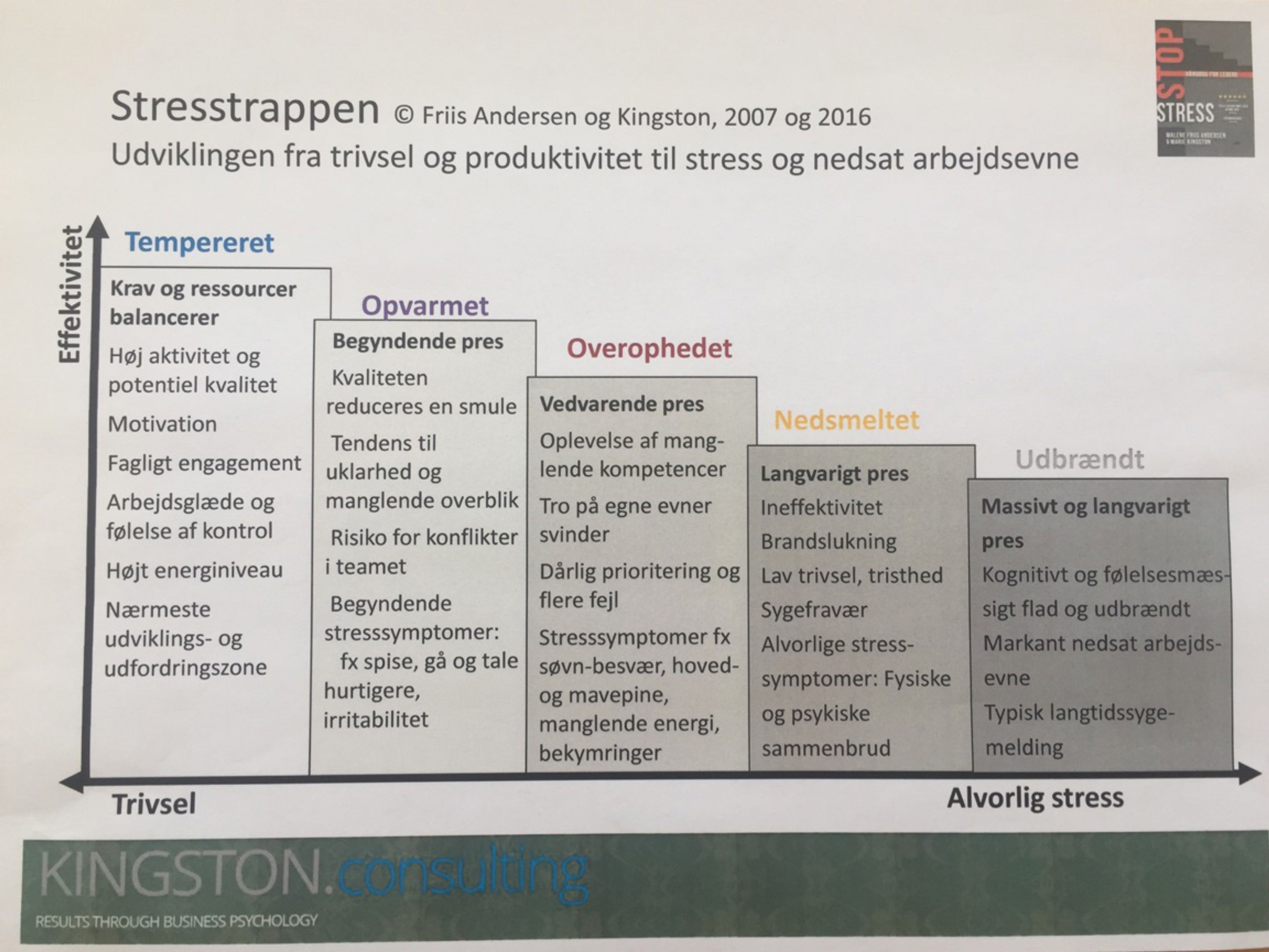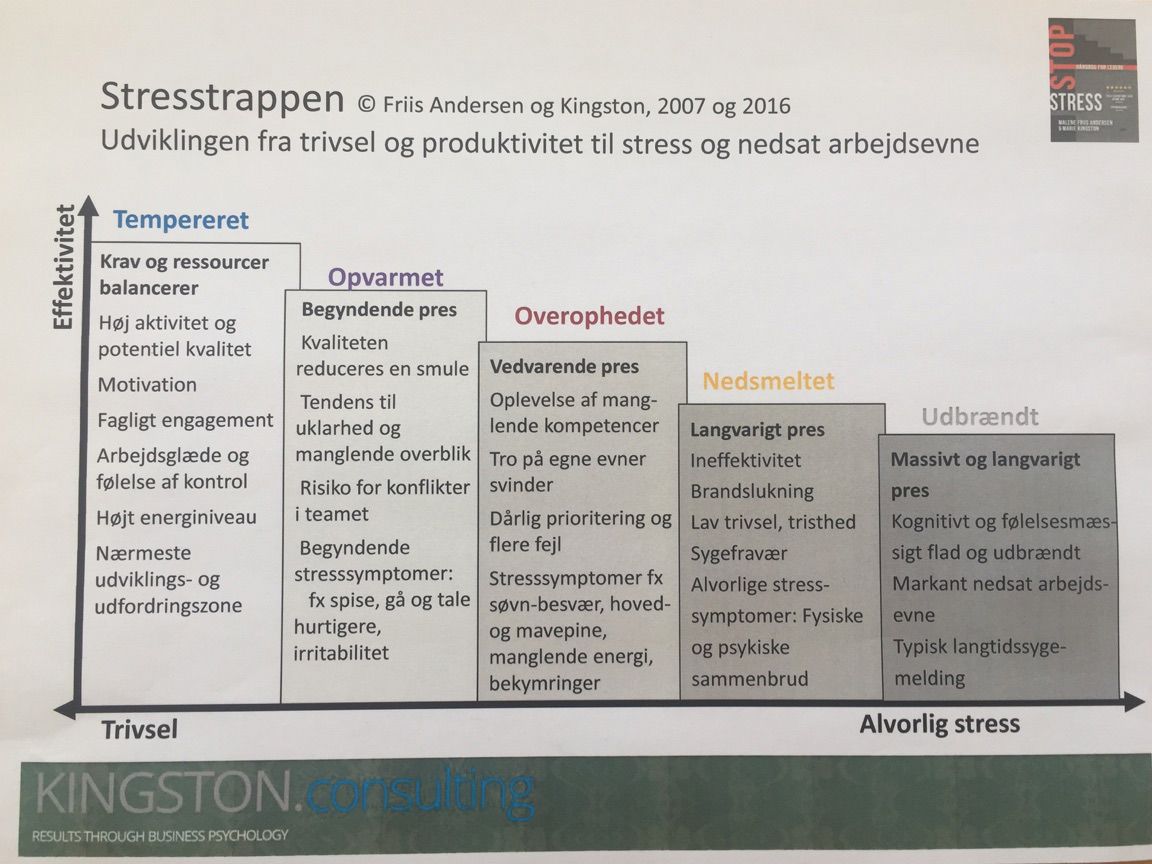I den ene ende af trappen, i den ”tempererede fase” er der balance mellem krav og ressourcer – og dermed høj trivsel og effektivitet. I den anden ende af trappen er man ”udbrændt” og typisk langtidssygemeldt.