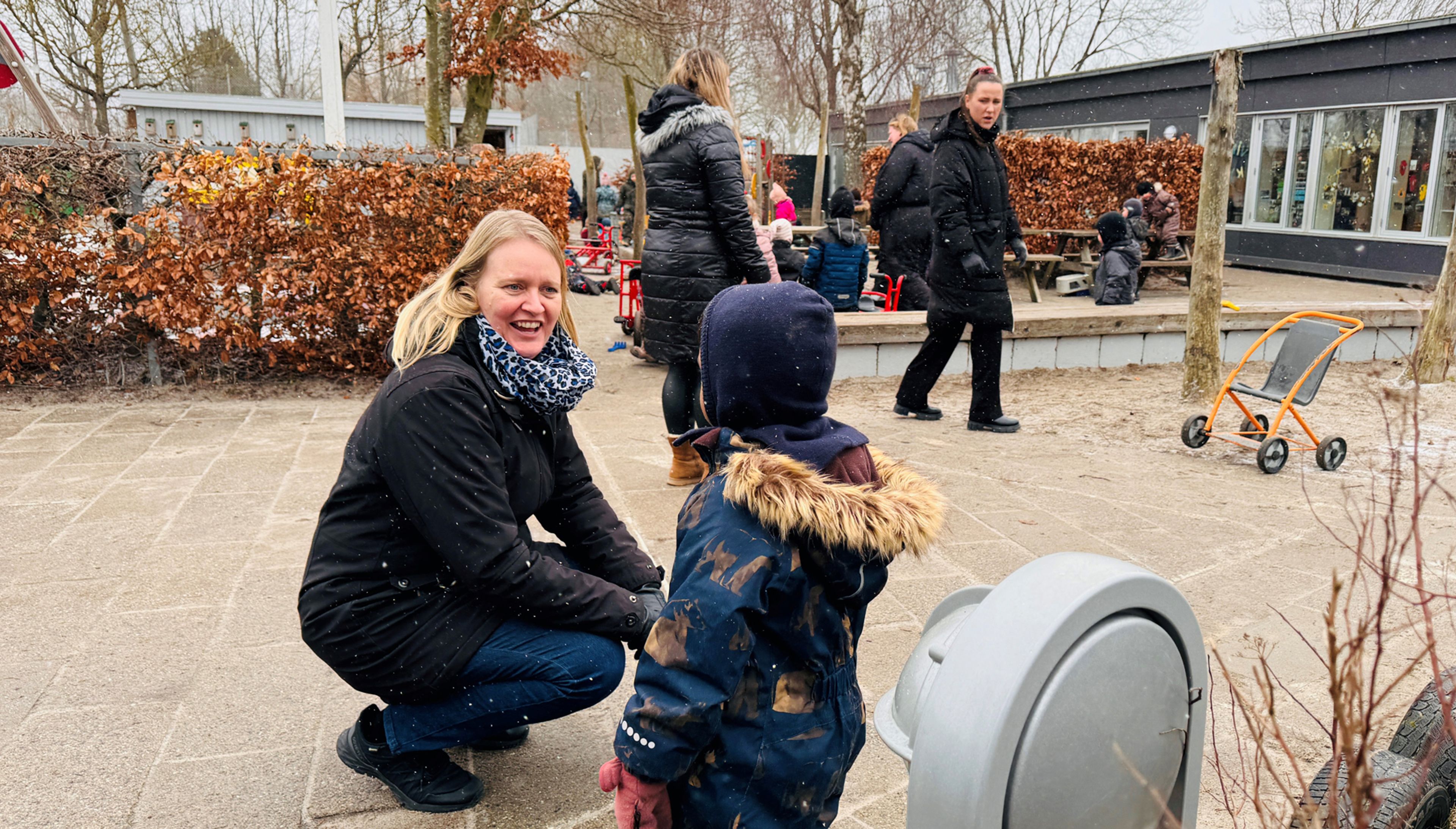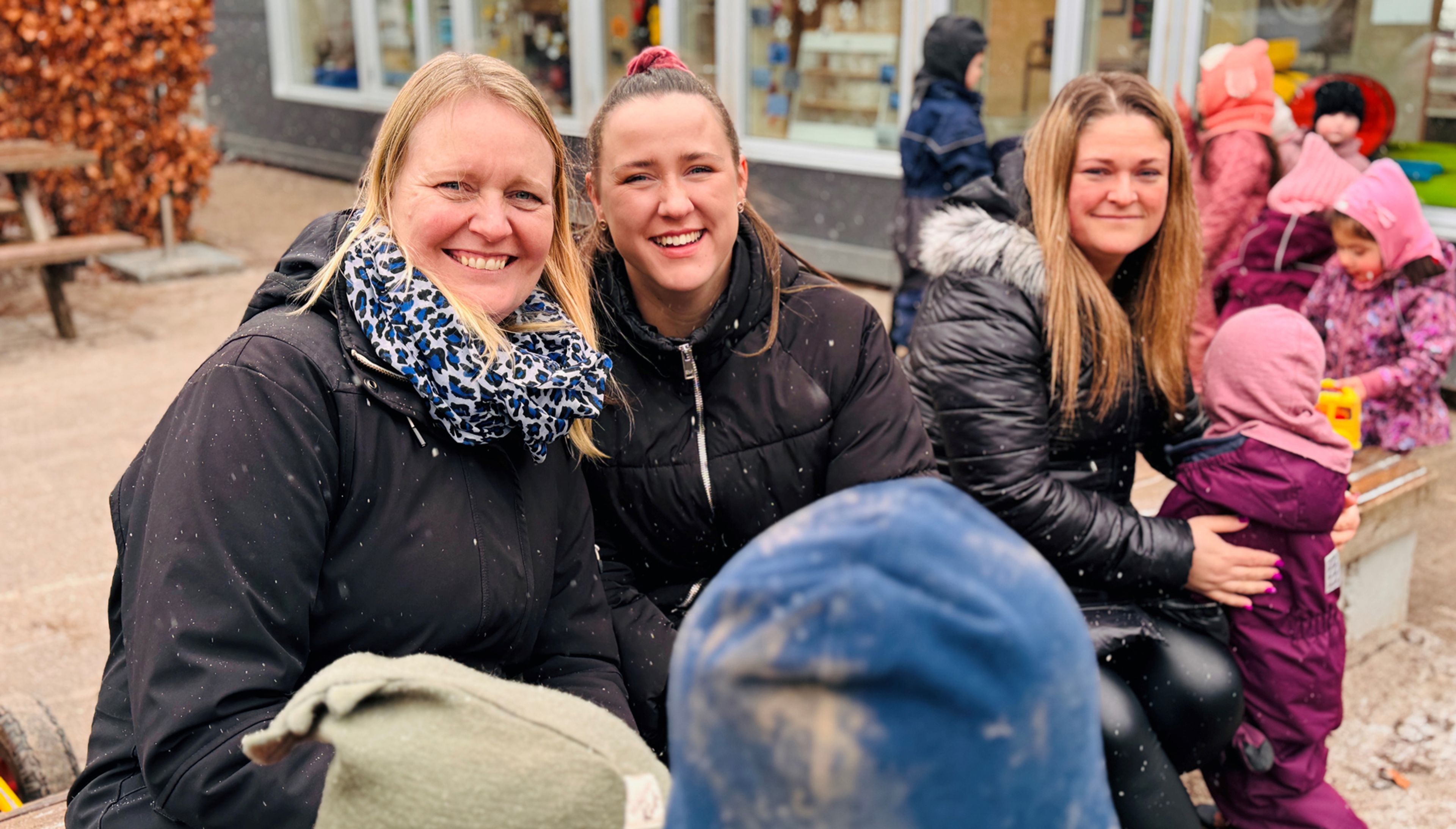 Rikke Peetz (i midten) er pædagogmedhjælper i børnehaven og er gået en time op til 36 timer om ugen. Hun har fredagsfri hver fjerde fredag og fleksibilitet i form af, at hun har en time til forberedelse, som hun kan placere, hvornår hun vil. Rikke Peetz har dog valgt at lægge den time fast hver torsdag eftermiddag.