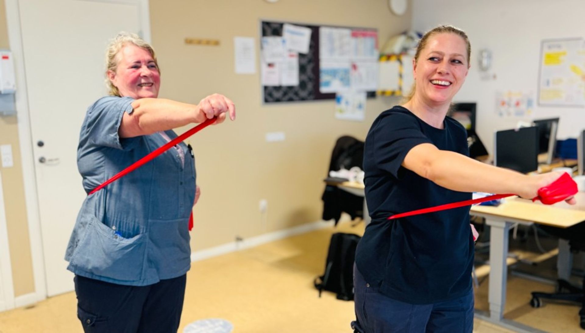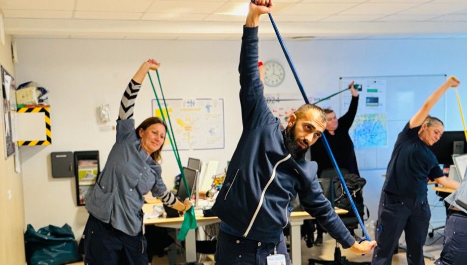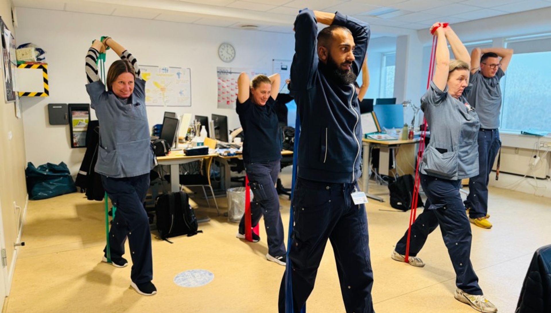 Medarbejderne finder træningselastikkerne frem mandag, onsdag og fredag umiddelbart efter frokostpausen, som alle holder i hjemmeplejebasen på Telegrafvej.
