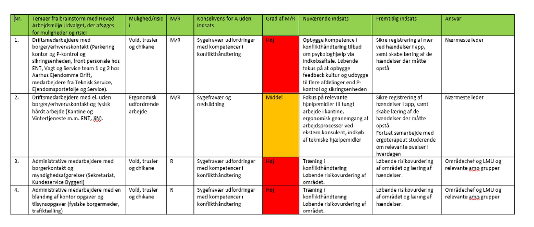Opdelingen i rød, gul og grøn ledsages af en systematisk liste over nuværende indsatser, fremtidige indsatser og konsekvens for medarbejdergrupper, hvis ikke der bliver lavet en indsats.