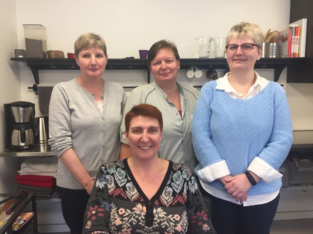 Tre mand frem for en leder: Fra venstre Vivi Larsen, arbejdsmiljørepræsentant for Kildehuset, Petrea Radzik, tillidsmand for FOA-personalet og arbejdsmiljørepræsentant for Kildebo, Charlotte Rasmussen. Siddende leder Lina Lauridsen.