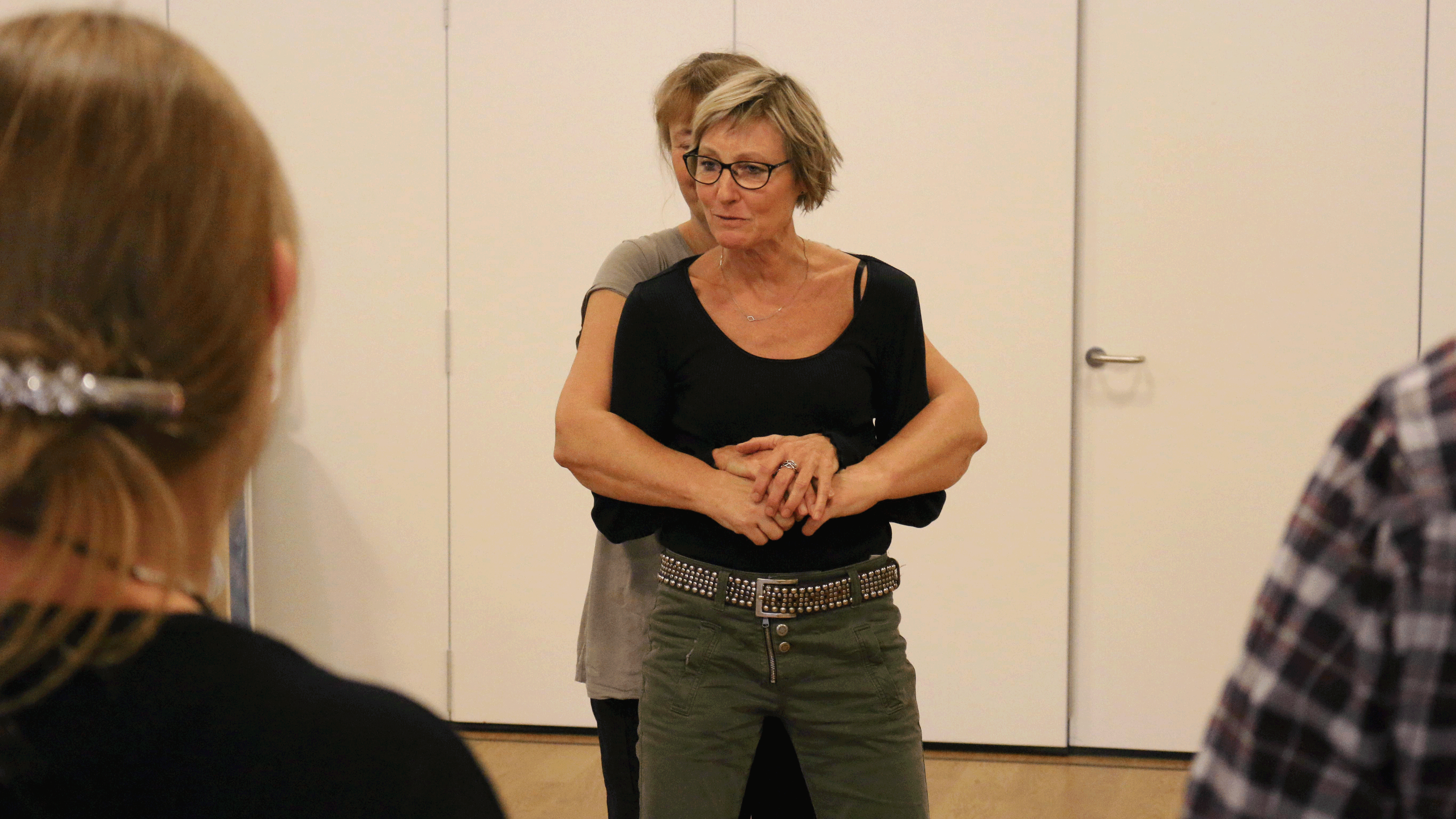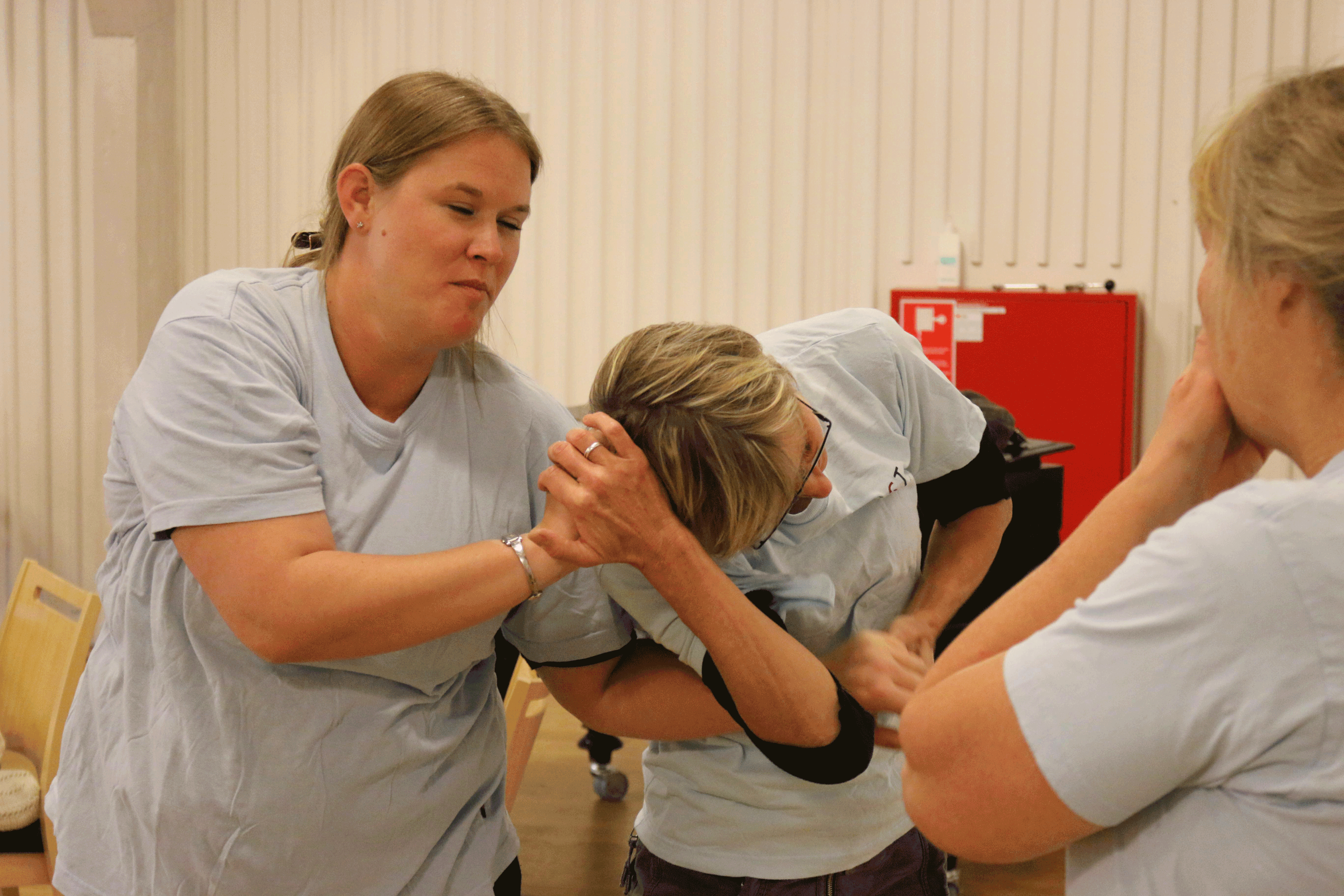 Grete Bergland, instruktør i nænsom konflikthåndtering, har netop demonstreret en afværgemanøvre på gulvet foran kursisterne. De er alle medarbejdere på botilbuddet Kellersvej i Gladsaxe Kommune, der er en samling specialiserede tilbud for mennesker med autisme og udviklingshæmning.