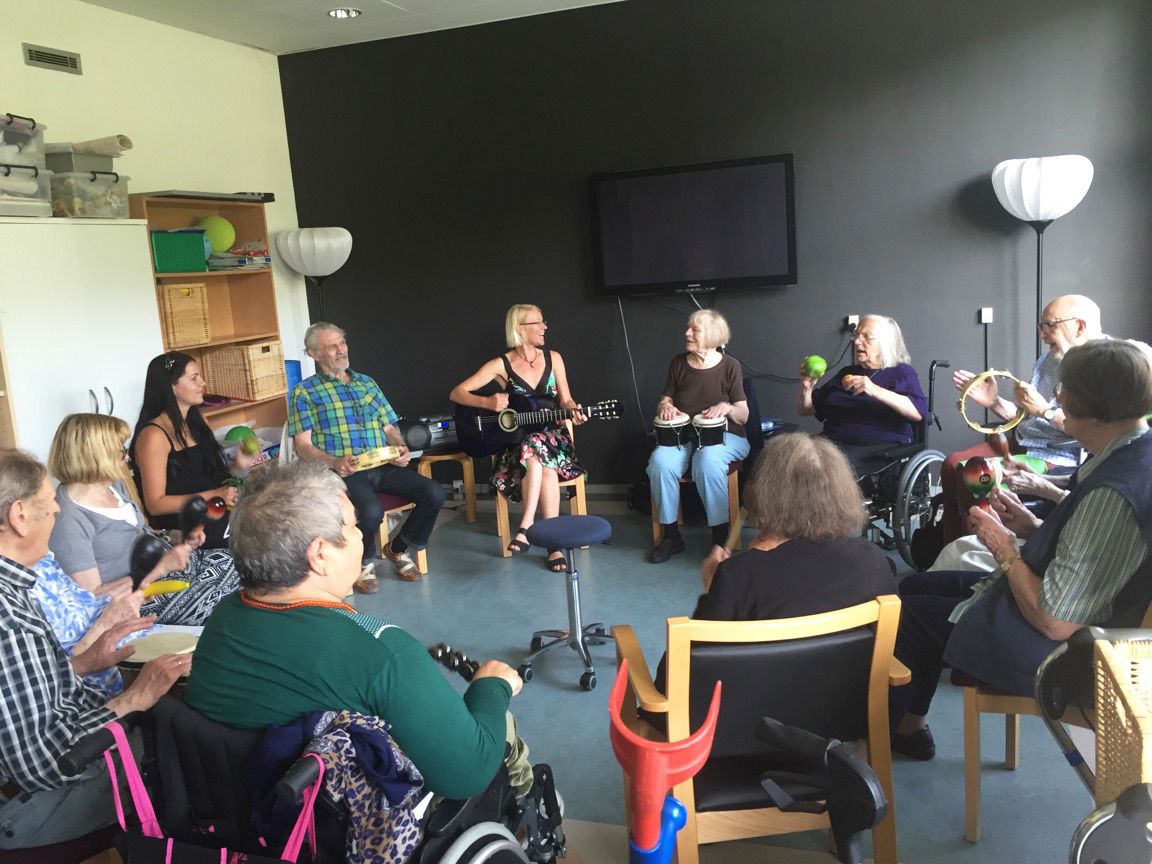 - Musikken tilpasset ud fra den enkelte beboeres individuelle musiksmag og stimuli-behov. Musikterapeutens opgave er derfor primært at skabe forskellige forums for mesterlære i forhold til, hvor medarbejderne kan bruge musikken som redskab.