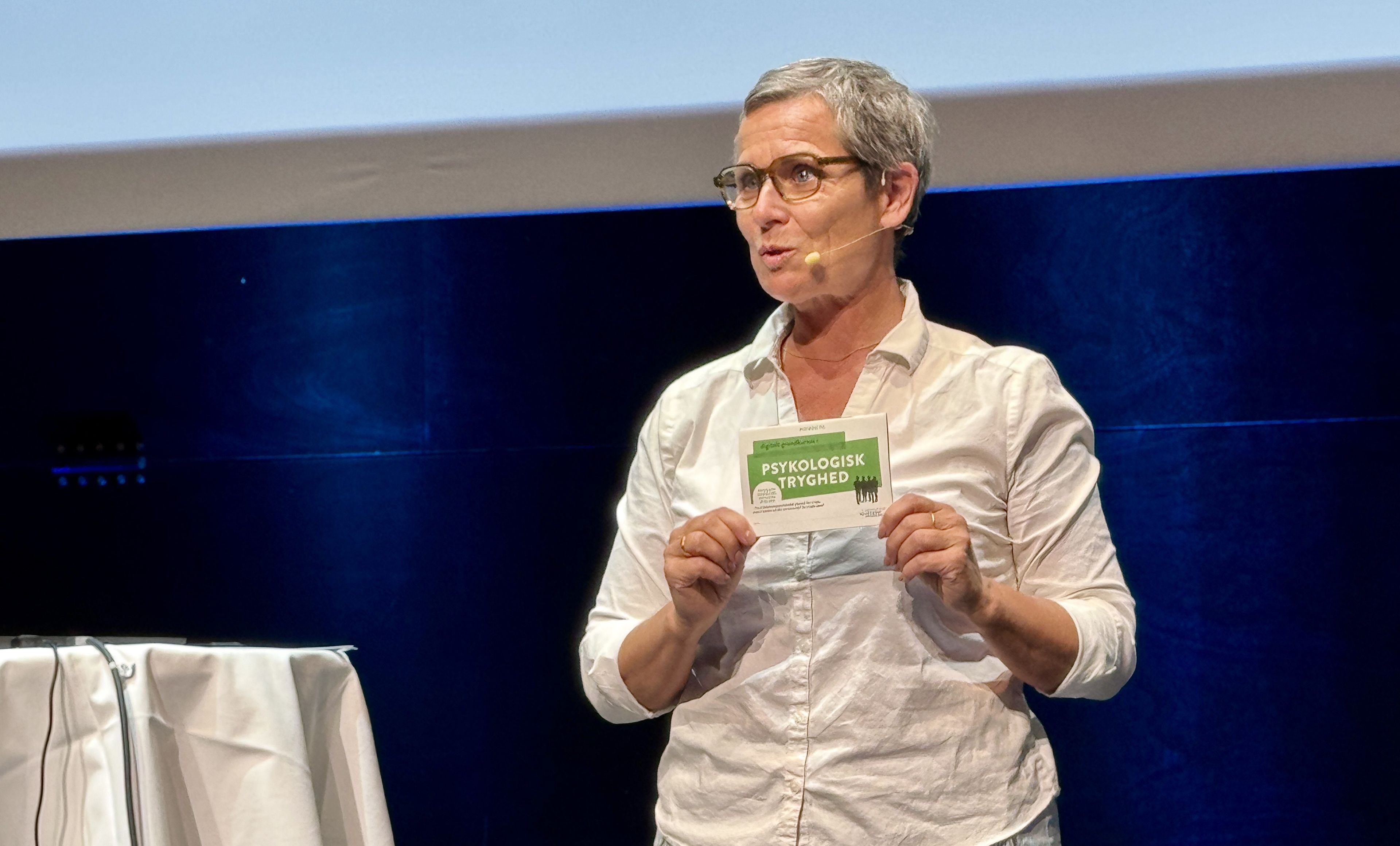 Dagens anden hovedtaler var psykolog Rikke Høgsted fra Institut fra belastningspsykologi, der har speciale i psykologisk tryghed. Hun fik deltagerne op af stolene med en pixibog med øvelser til at øge den psykologiske tryghed.